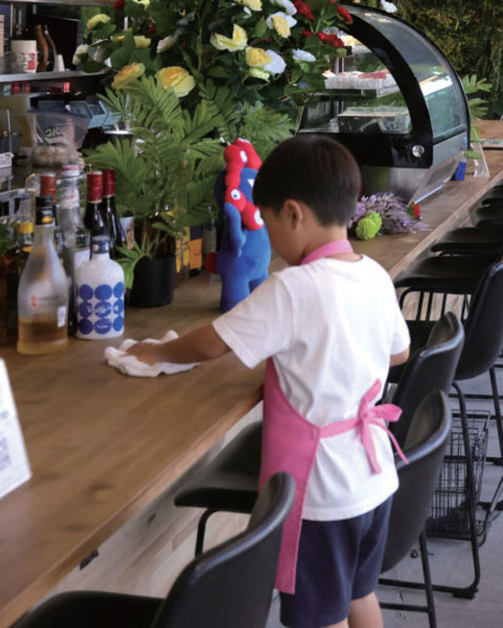 ドリンクを運んだり、テーブルを整えたり。小さな店員さんに変身♪