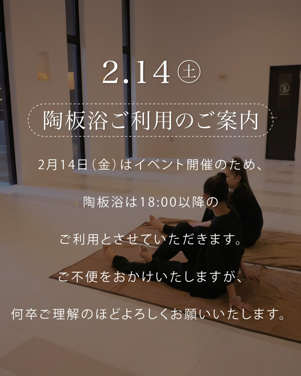 2月14日(金)は館内イベント開催のため、陶板浴のご利用は18:00以降とさせていただきます。