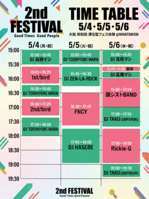イベント一覧 タイムテーブル大公開🔥 2026.5.4(月) .5(火) .6(水) 2周年記念スペシャルイベント「Good Times Good People」